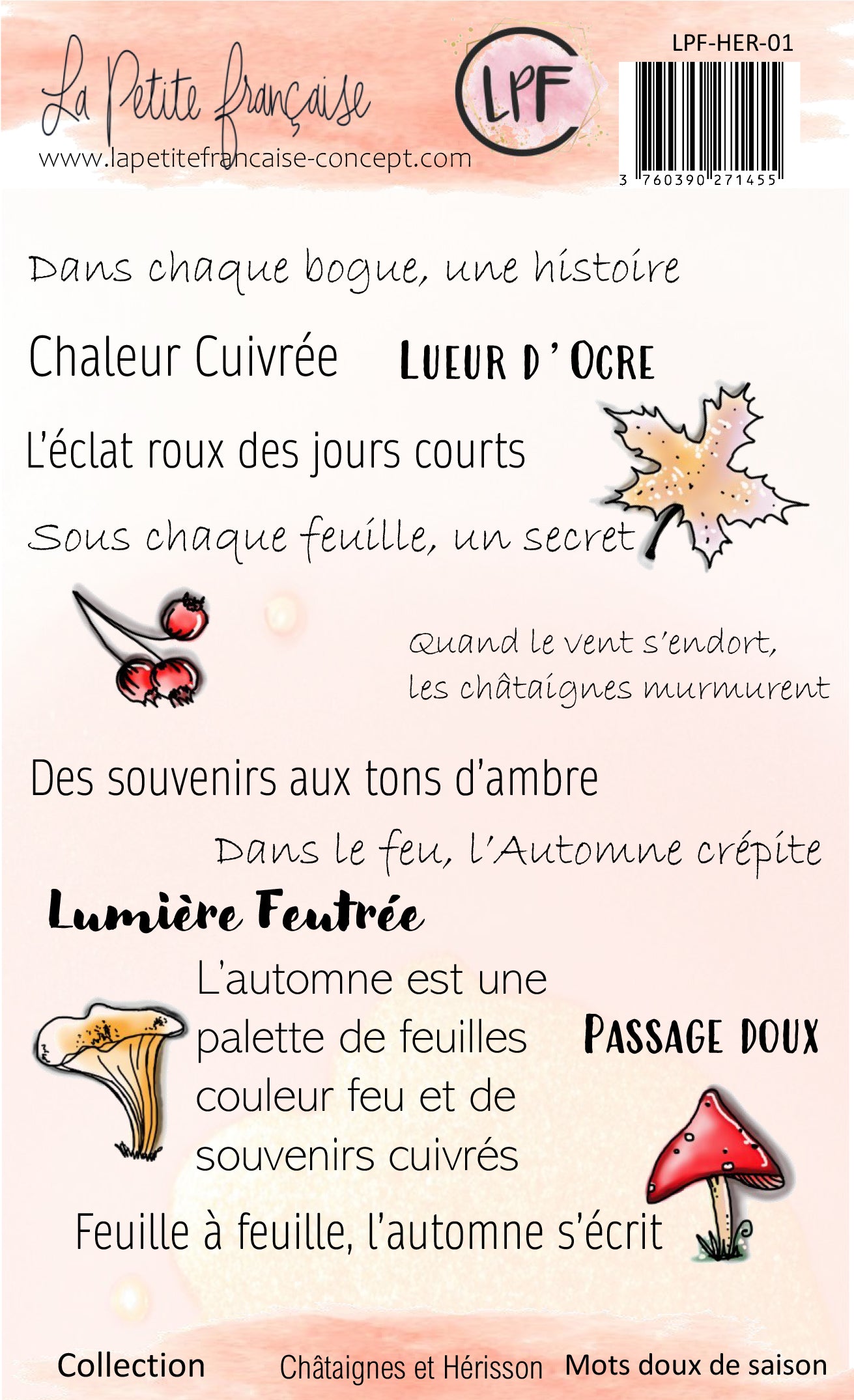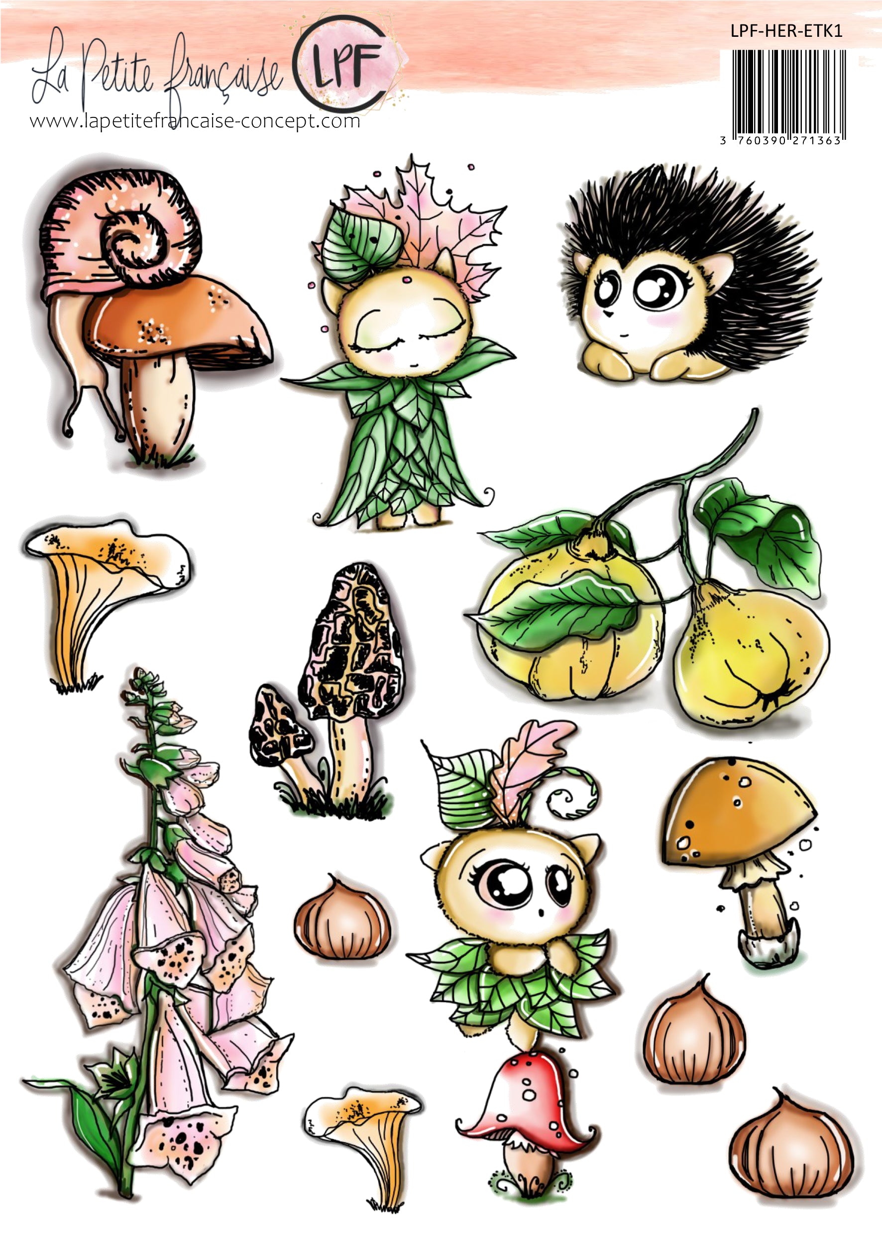 Pack comprenant les 5 planches de tampons et la planches de motifs à découper de la collection Châtaignes et hérisson à tarif préférentiel