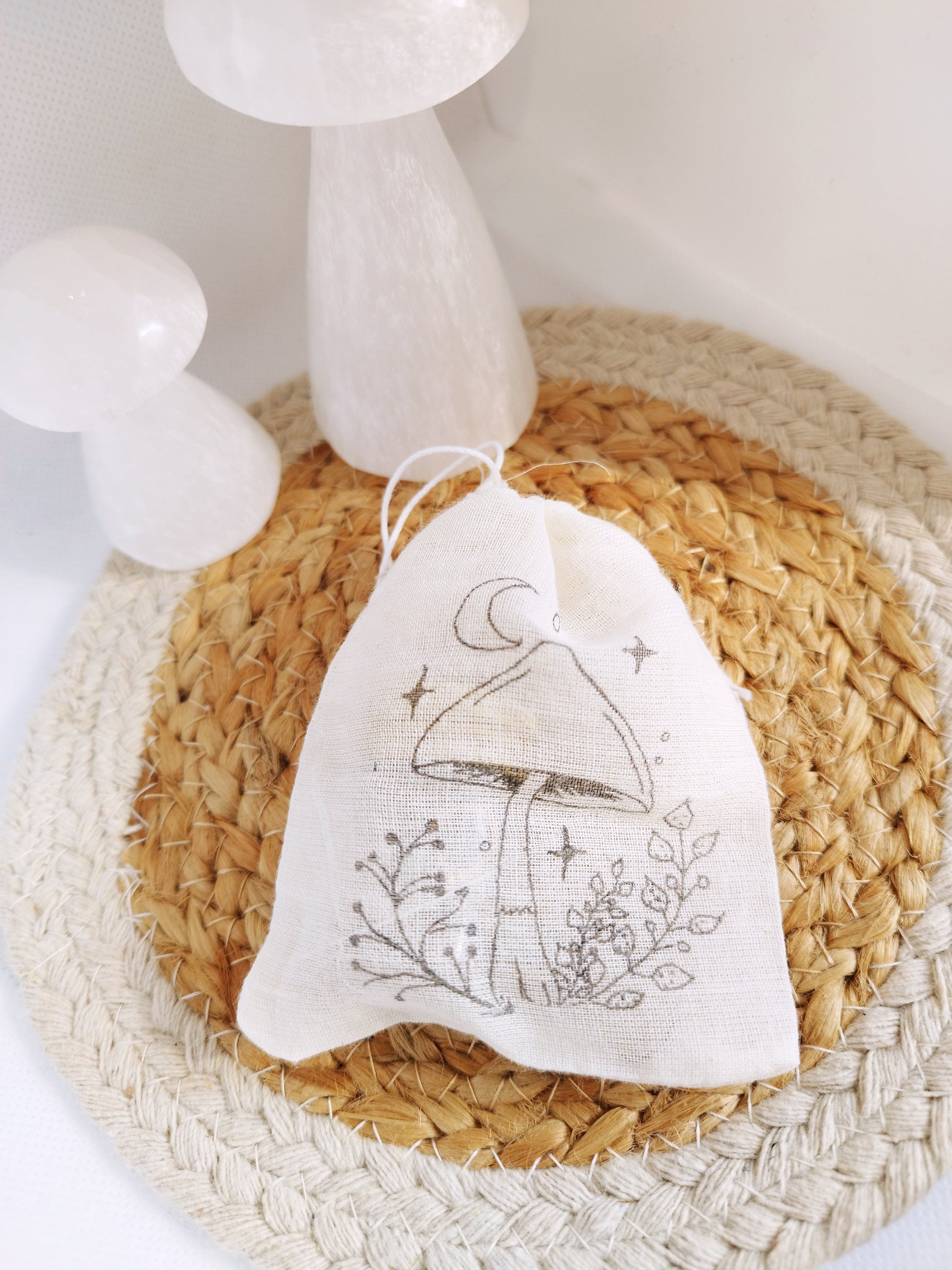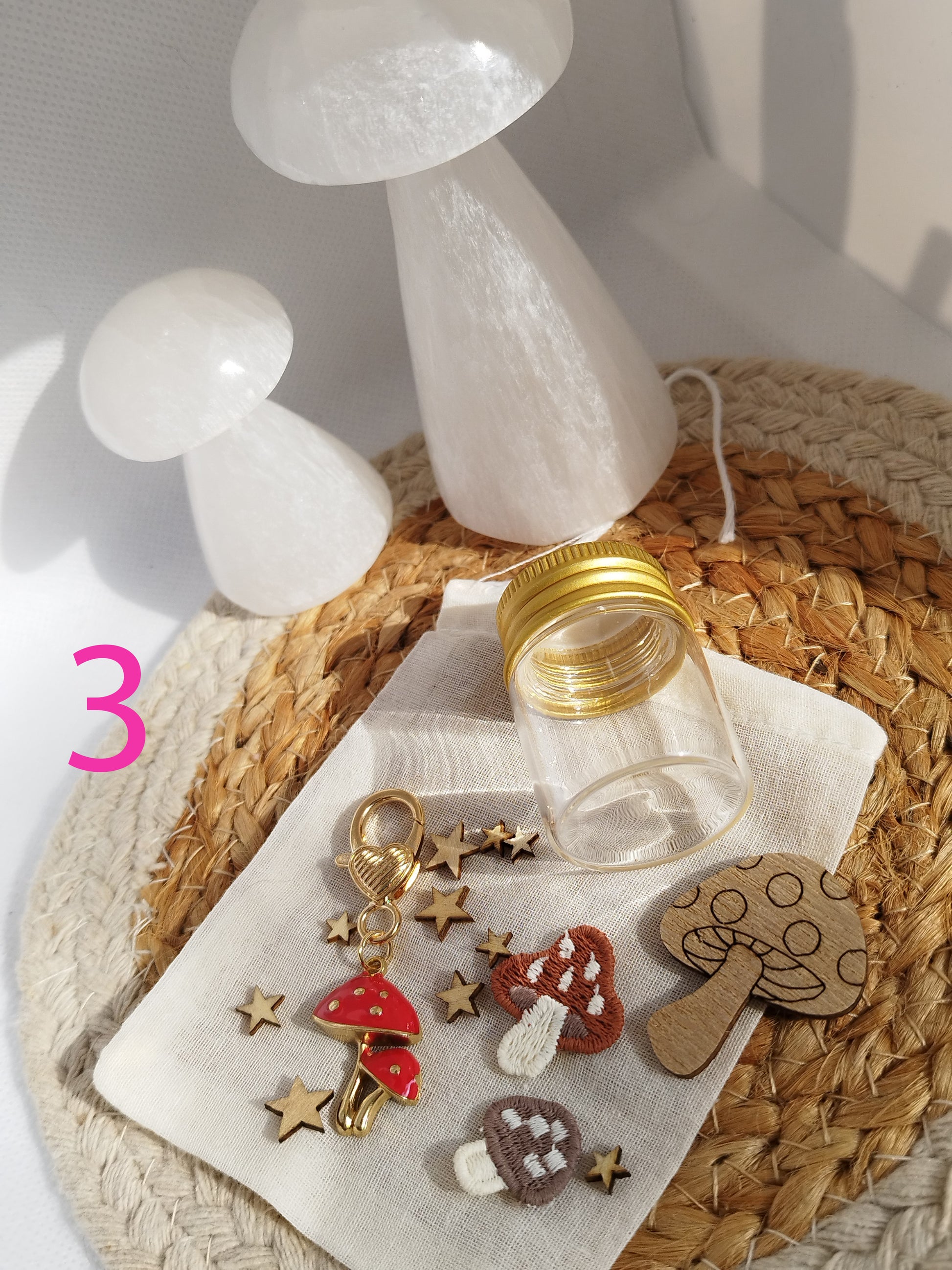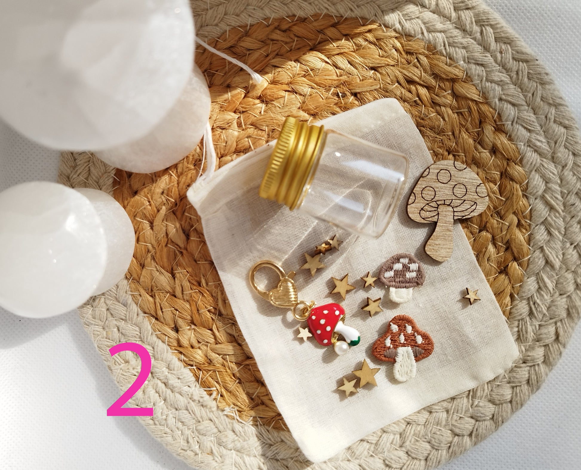 pochon décoré contenant un assortiment de champignons magiques: pot en verre, champignon en bois, étoiles en bois, 2 champignons brodés, et un champignon mousqueton coeur