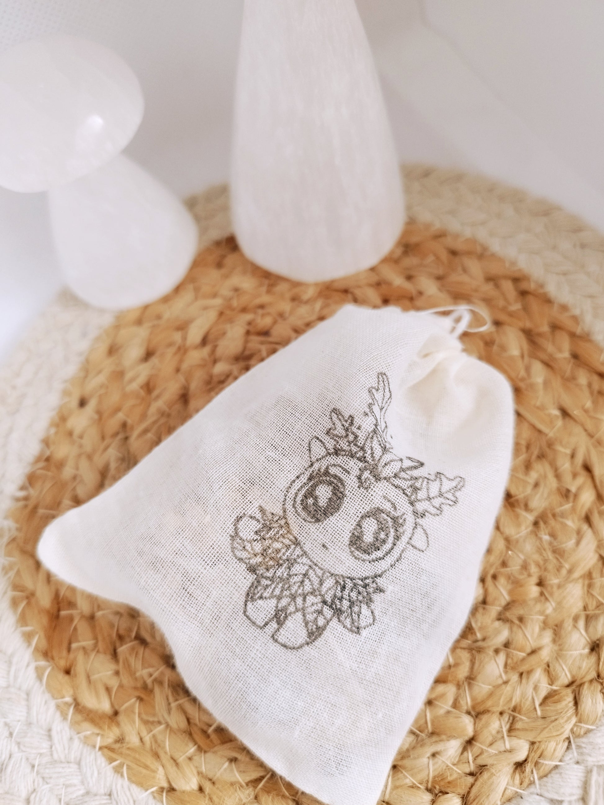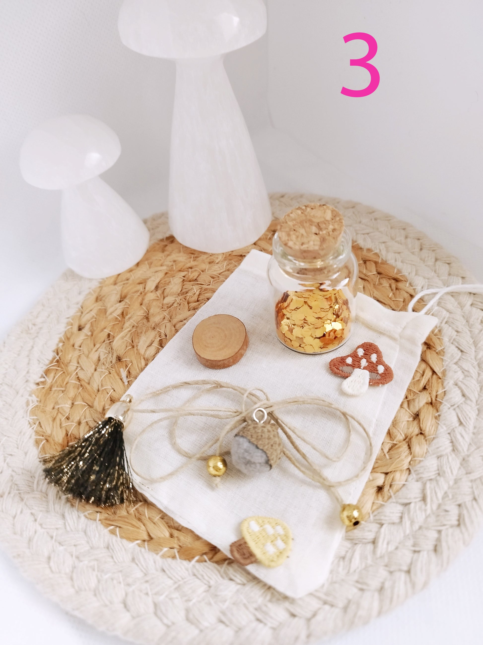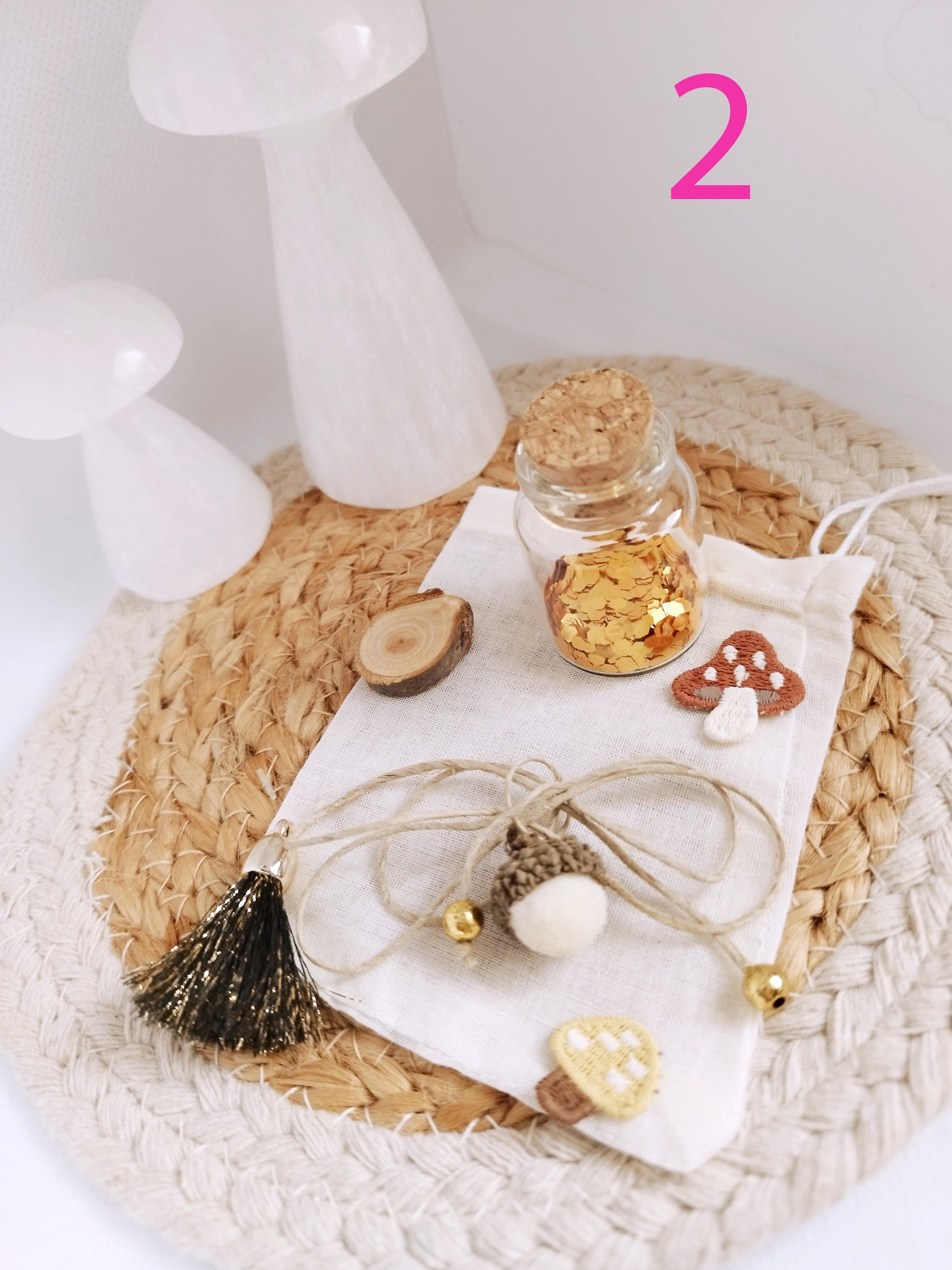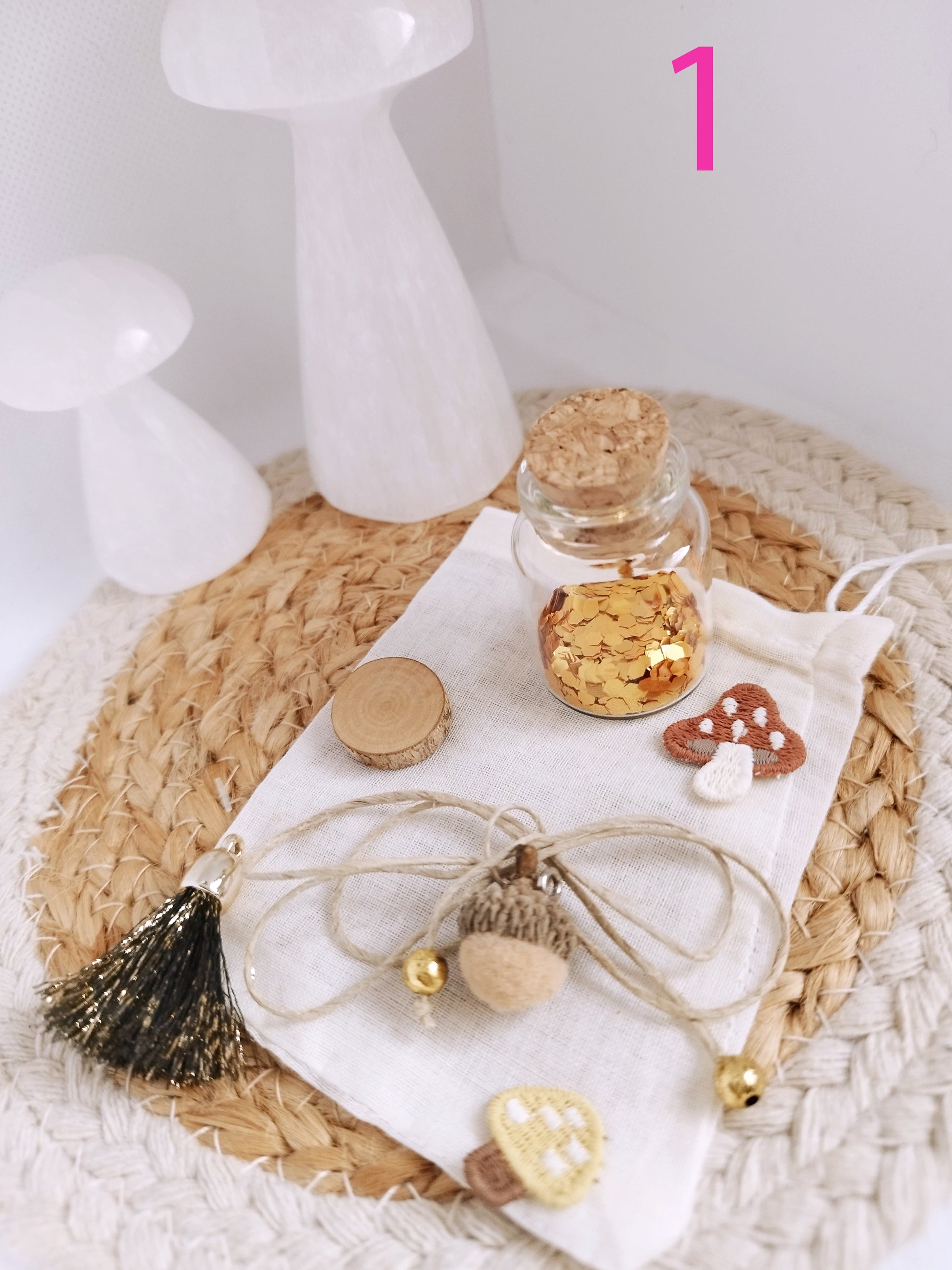 Petit gardien de la nature a rassemblé tous les éléments pour fabriquer sa fiole magique: poussière d'étoiles dorées, rondin de bois sacré, champignons magiques, cordelette enchantée, perles de mousse dorées, gland pompon véritable et pampille magique.